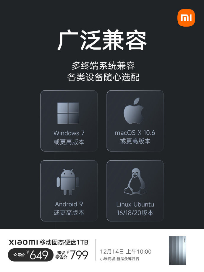 IT之家了解到,小米移动固态硬盘 1TB 广泛兼容多终端系统、各类设备,包括Windows 7或更高版本、macOS X 10.6 或更高版本、Android9 或更高版本、Linux Ubuntu16/18/20 版本。