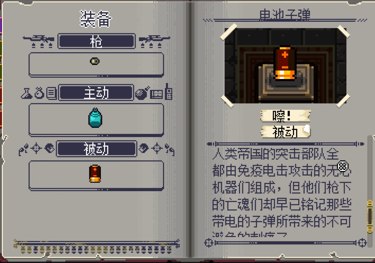 而從機器人的右手來看,這是一把不夠精巧,槍管也很短的垃圾槍械。即便被人類搶奪,也無法發揮出任何威力,然而在人工智能的校準配合電池子彈的精準度與雷電,卻能讓它變爲恐怖的威力。成爲所有角色中,最爲強力的初始槍械。