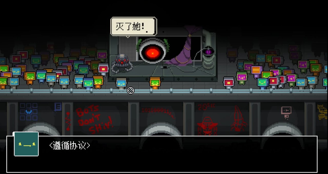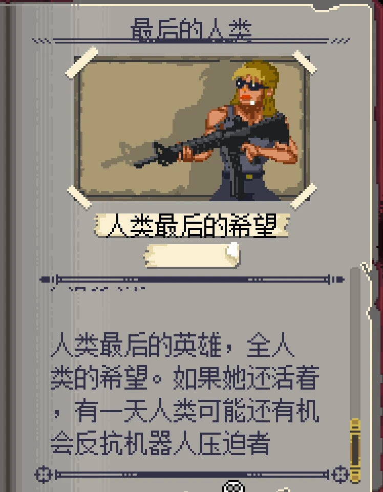 它所面對的Boss,在圖鑑裏被稱爲最後的人類,如果她還活着,就有反抗機器人壓迫者的希望。否則,機器人的殺戮集團,就將清理人類所有的殘黨。