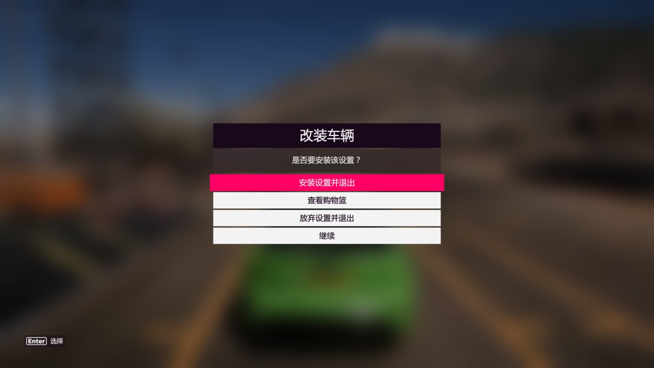 进入赛道后按回车键并随意进行改装,后选择退出比赛并选择“安装设置并退出”即可。