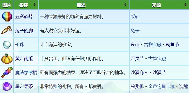 ①村民普遍最喜欢的礼物,除了海莉不喜欢五彩碎片,潘妮不喜欢兔子脚。
