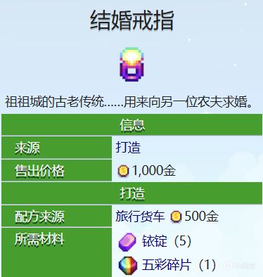 ④结婚戒指打造配方从旅行货车以500金购买获得。结婚戒指可以装备,但没有任何加成效果。不能给予村民。
