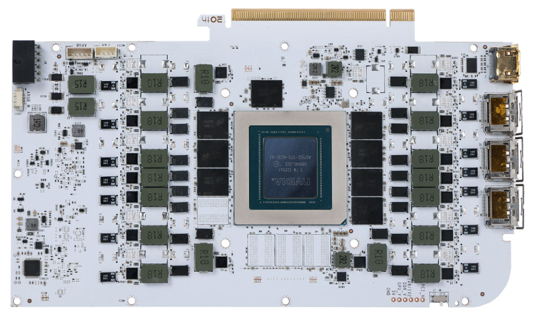 14層全白PCB,GPU核心型號AD102-175,14+3相供電,單顆2GB,共8顆GDDR6X 顯存顆粒。