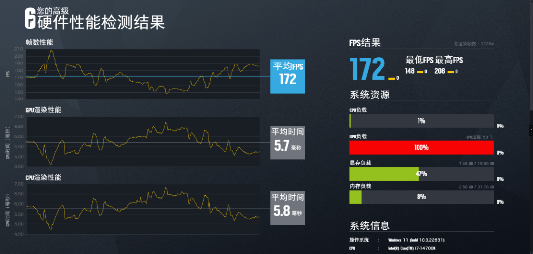 《彩虹六號·圍攻》基準測試,畫質超高,渲染倍數100,4K分辨率下,遊戲平均幀率爲172 FPS;
