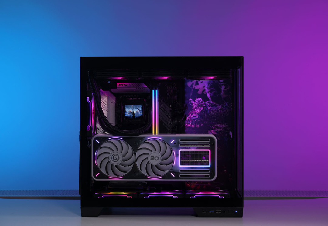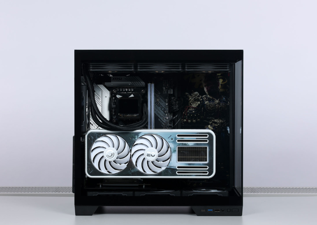 將散熱、電源全部鎖入機箱後,給機箱側面風扇位上安排上一塊《黑神話·悟空》定製燈板,其餘風扇位則全部安排上影馳夢境Pro黑色散熱風扇;