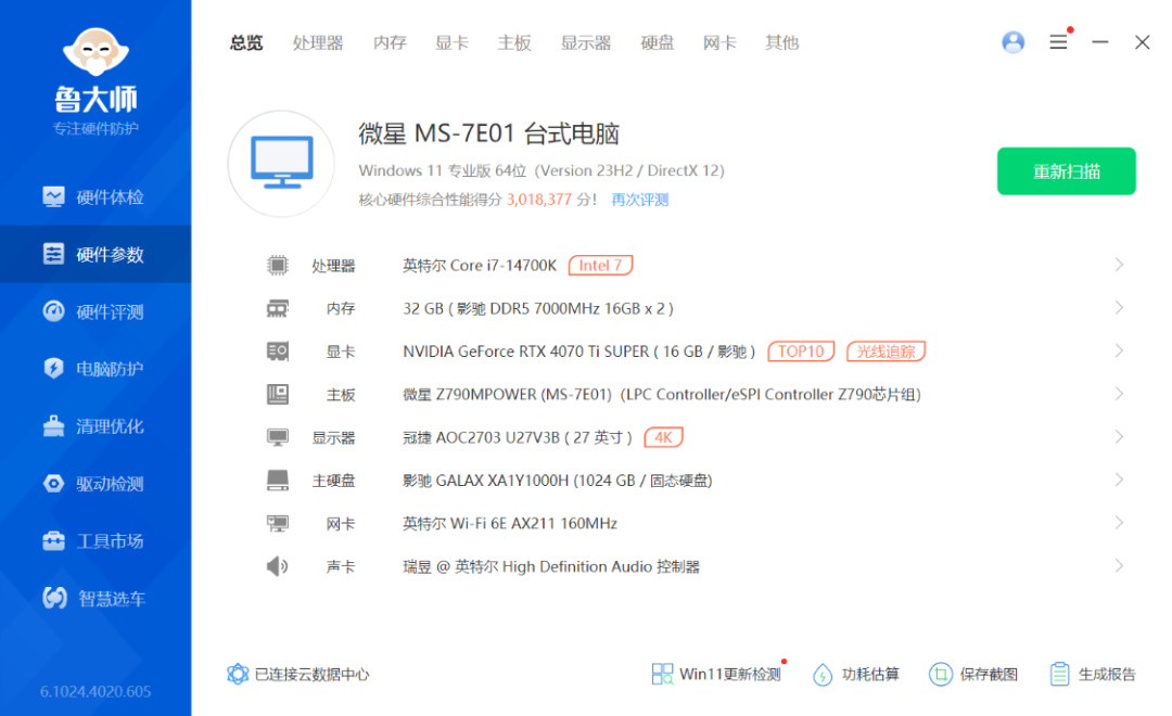 完整配置單:Intel i7-14700K處理器、微星Z790MPOWER主板、影馳RTX 4070Ti Super特別紀念版顯卡、HOF Pro D5-7000MHz 16G*2內存、星曜7000Plus 1T M.2固態硬盤、星曜G360 黑色限定款一體式水冷、沐光MAX 黑色海景房機箱、GL-850 ATX 3.1 黑色金牌全模組電源、影馳夢境Pro 黑色散熱風扇*4(3反+1正)、黑神話悟空定製燈牌*1、豎裝支架*1、pcie4.0顯卡延長線*1...整機預算1.3W左右,顏值稅含量不低,僅供參考。
