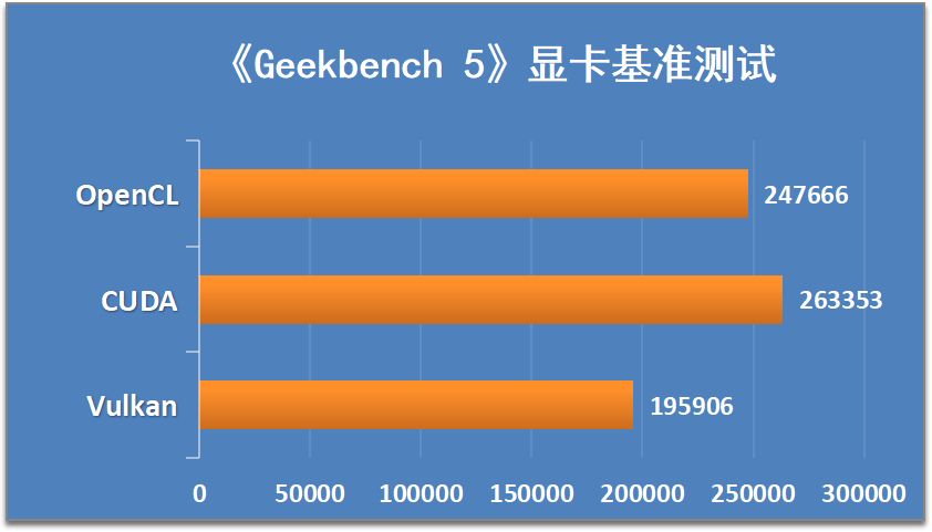 通過GeekBench 5顯卡測試,我們可以測試出顯卡在處理不同的GPU硬件加速計算模型時的性能表現。在OpenCL測試中,顯卡得分247666分。在CUDA測試中,顯卡得分263353。在Vulkan測試中,顯卡得分195906分;
