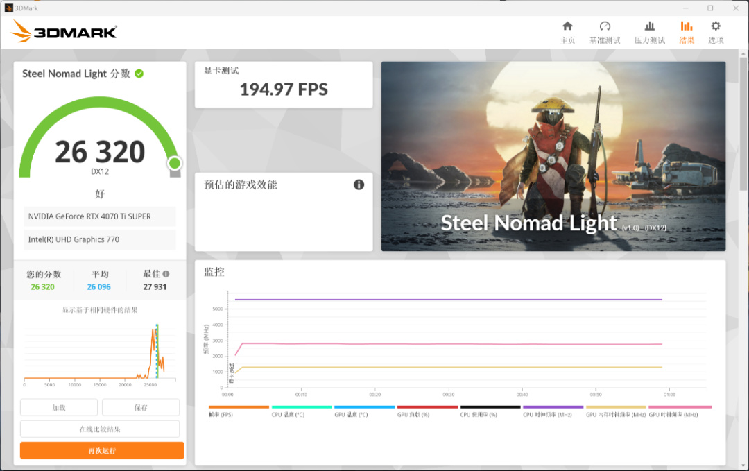 Steel Nomad Light遊戲基準測試,可以測試出顯卡在遊玩2K分辨率,圖形API爲DX12遊戲的平均幀數,並根據幀數穩定性進行評分。整機得分爲26320分,遊戲平均幀數爲194.97FPS;