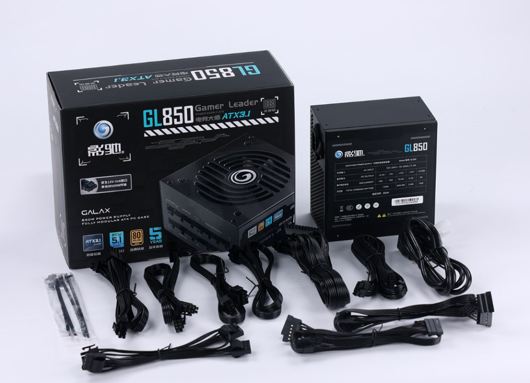 電源方面,選擇的是黑色的GL-850 ATX 3.1金牌全模組電源。支持最新的ATX 3.1電源規範和PCIE 5.1電源標準,電源搭載了一個12V-2x6顯卡供電接口,搭配上電源標配的12V-2x6供電線,理論最高可提供600W的供電輸出,可以輕鬆應對40系顯卡的供電需求;