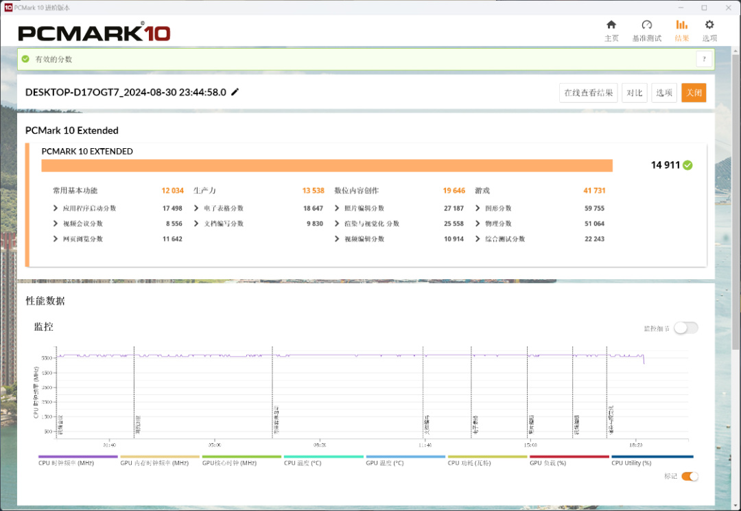 PC Mark Extended整機測試,整機得分14911分,常用基本功能測試得分測試12034分,生產力得分13538分,數爲內容創作得分19646分,遊戲得分41931分;