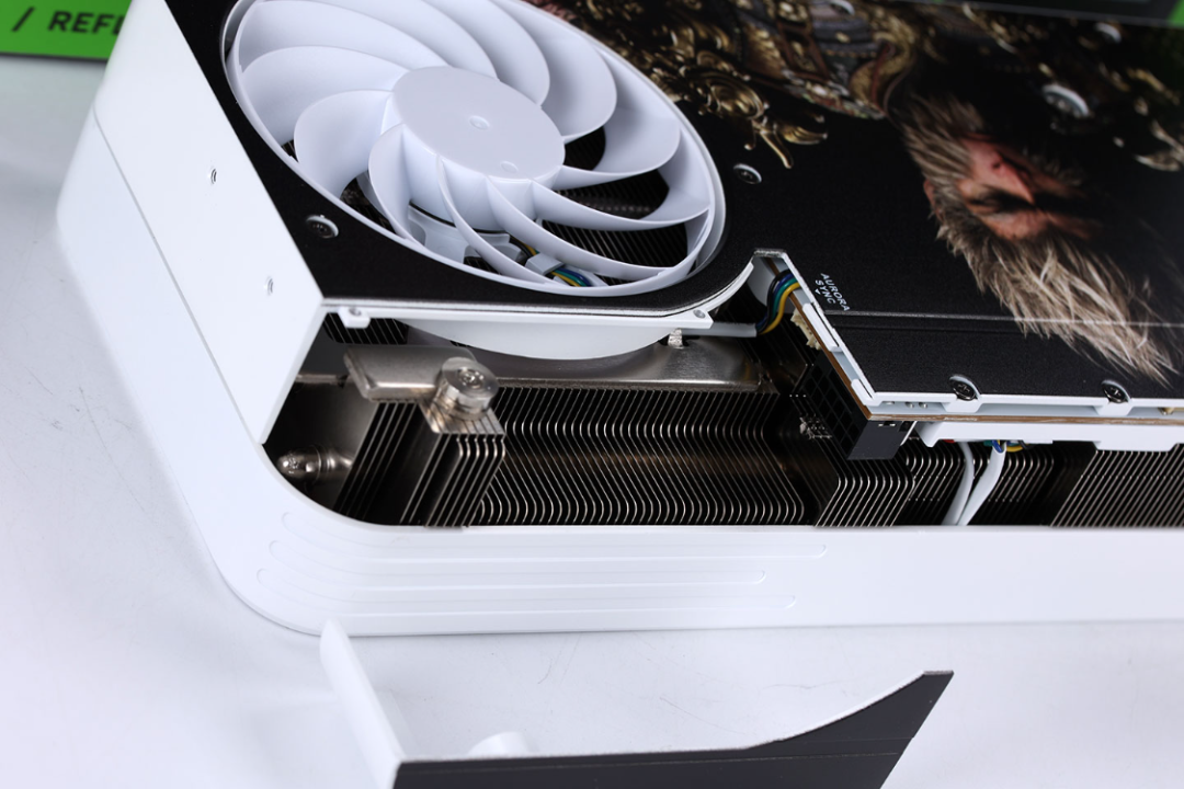 顯卡三圍:344*152.3*60mm(含擋板),330*137.7*60mm(不含擋板)。外觀上沿用了影馳20週年系列外形設計,但是顯卡正面亞克力散熱外殼以及金屬背板,均融入了黑神話:悟空遊戲內元素。正面雙風扇(100mm)進風,背面單風扇(90mm)送風的獨特設計,帶來優秀質感表現的同時,也保障了顯卡的散熱。
