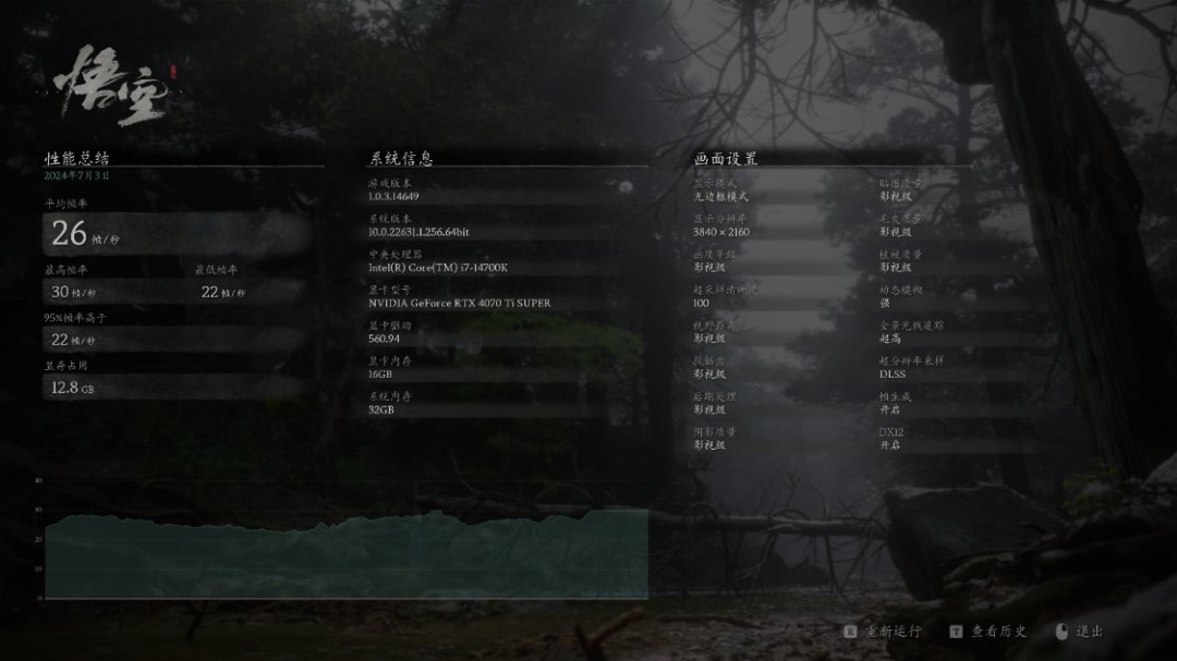 《黑神話悟空》遊戲基準測試,影視級畫質,光追設爲超高,開啓DLSS 3.0,4K分辨率下,將超採樣清晰度設爲25,遊戲平均幀數爲97幀/秒,將超採樣清晰度設爲50,遊戲平均幀數爲67幀/秒,將超採樣清晰度爲75,遊戲平均幀數爲46幀/秒,將超採樣清晰度爲100,遊戲平均幀數爲26幀/秒;