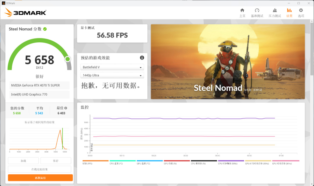 Steel Nomad遊戲基準測試,可以測試出顯卡在遊玩4K分辨率,圖形API爲DX12遊戲的平均幀數,並根據幀數穩定性進行評分。整機得分爲5658分,遊戲平均幀數爲56.58FPS;