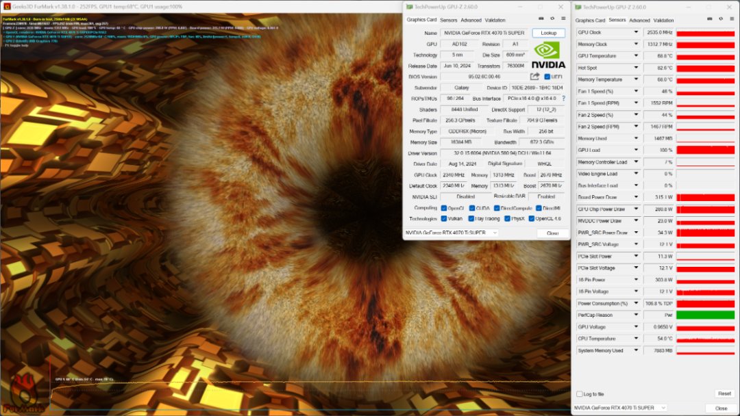 FurMark烤機測試,烤機15 Min,顯卡溫度爲69°左右,顯卡功耗爲315W左右;