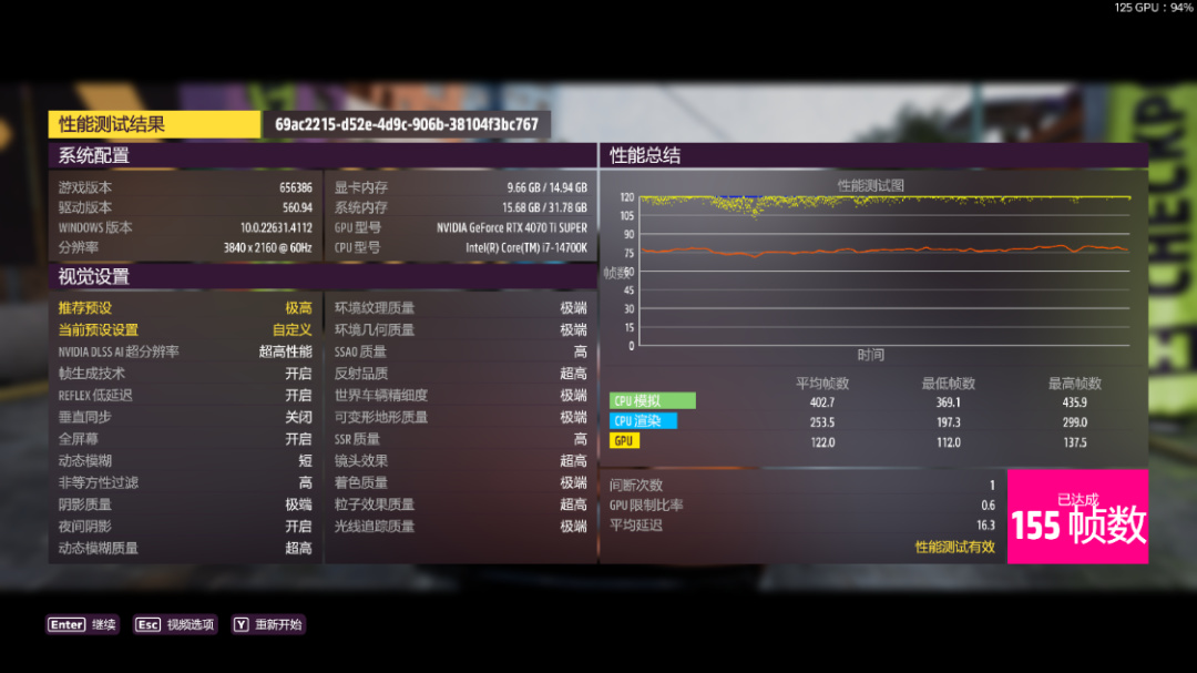 《極限競速·地平線5》測試,極端畫質,極端光追,開啓DLSS 3.0並設爲超級性能模式,4K分辨率下,遊戲平均幀數155 FPS;