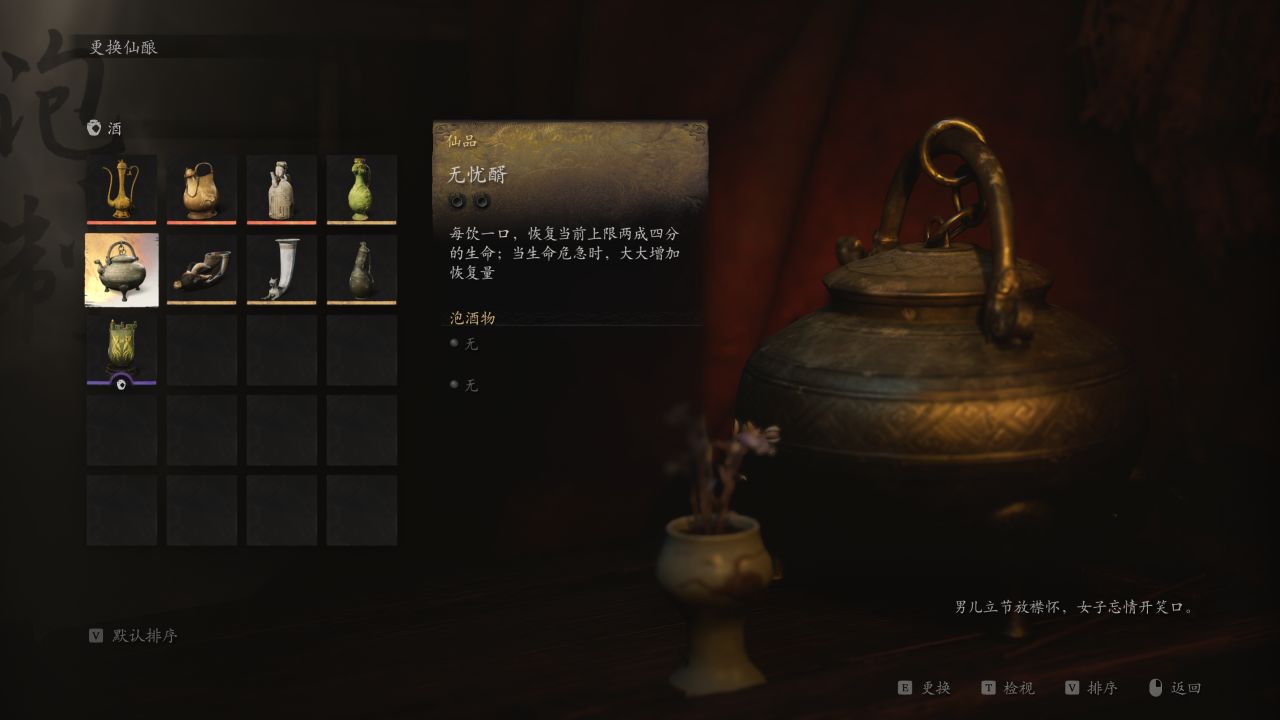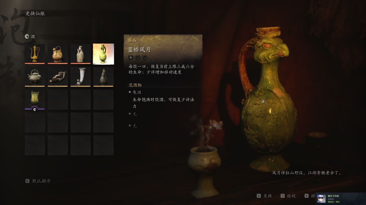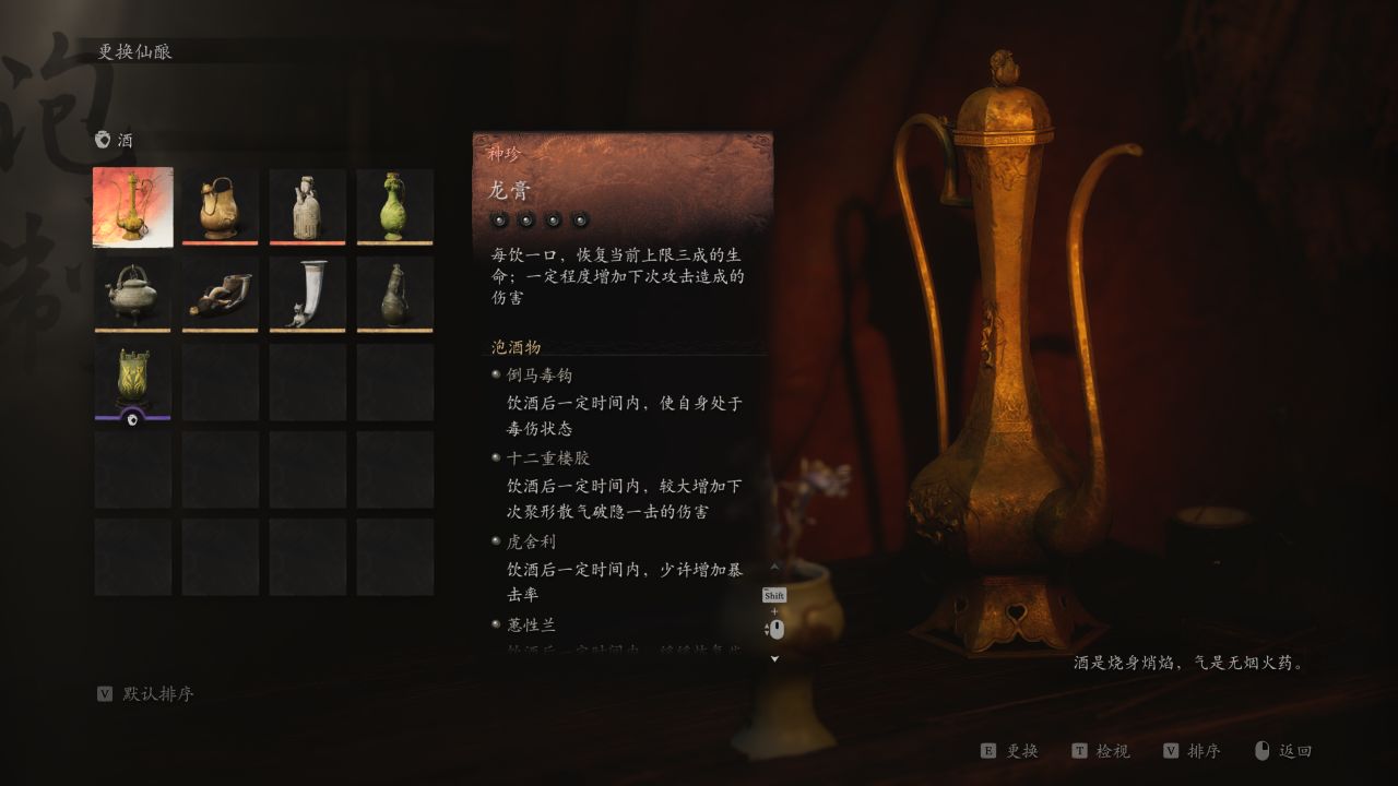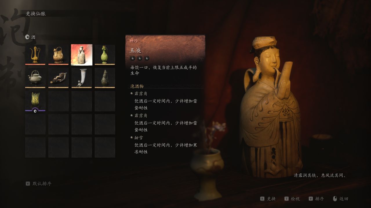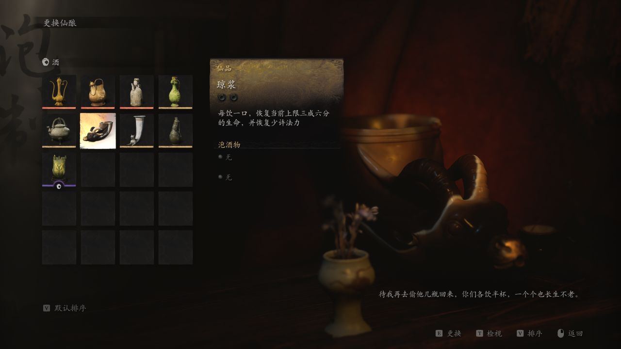 和其他功能酒一樣,一口回不了多少血,功能性也不太夠,湊合用吧,相比金身套棍花暴擊回元氣,這個酒回的很慢了,它更多的作用是你摸不到的時候,但是元氣還差一點,可以回一口這個補上補滿,畢竟元氣流比如說芭蕉扇,隼居士,或者靠蛤蟆打傷害等,對血量回復需求也沒有多高,但總體來說給的還是挺少,泡酒物有三個位置也不弱,至少有用武之地。