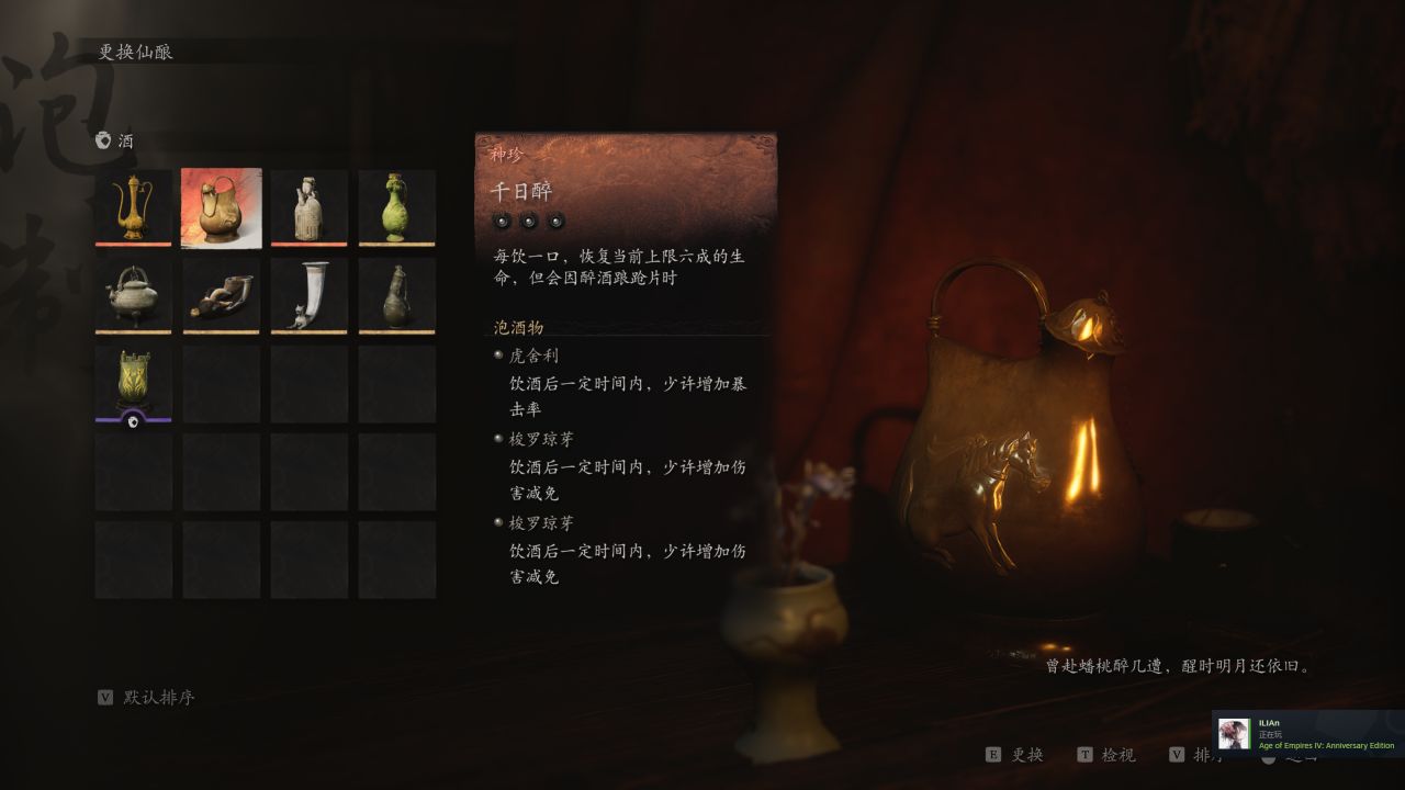 這個算是神酒之一了,回覆血量的數量基本由葫蘆決定,而酒是恢復量,其恢復量非常之高,缺點是它要持續回覆八秒,多周目可能因爲一下滿不了失誤被秒掉。但這同樣也是優點,可以最大化減少妙仙葫蘆的副作用,也可以減少毒套持續扣血的部分副作用,配上妙仙葫蘆一口都能回超過一半的血量。當然最大的缺點是泡酒物欄位少,只有兩個。