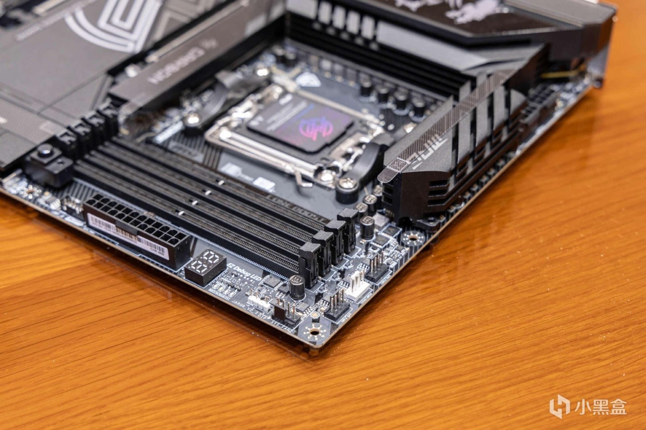 這款主板採用都是是標準ATX規格,主板採用了黑色PCB+黑灰色散熱裝甲的組合。散熱裝甲的覆蓋面積相當誇張,擴展型VRM散熱片上可以看到醒目的MSI龍紋圖案,M2和南橋散熱裝甲也整合成片,並且能看到MPG的標誌。