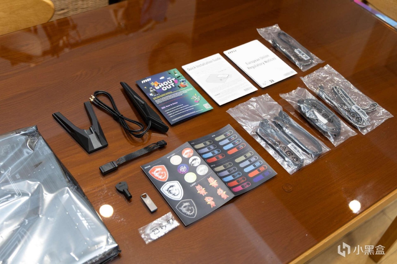配件方面,微星MPG X870E CARBON WIFI出廠時提供了WIFI7天線,雙SATA數據線,4Pin延長線,IO控制延長線,M2固定螺絲,U盤,擰螺絲工具,說明書質保卡和MSI龍盾貼紙等。