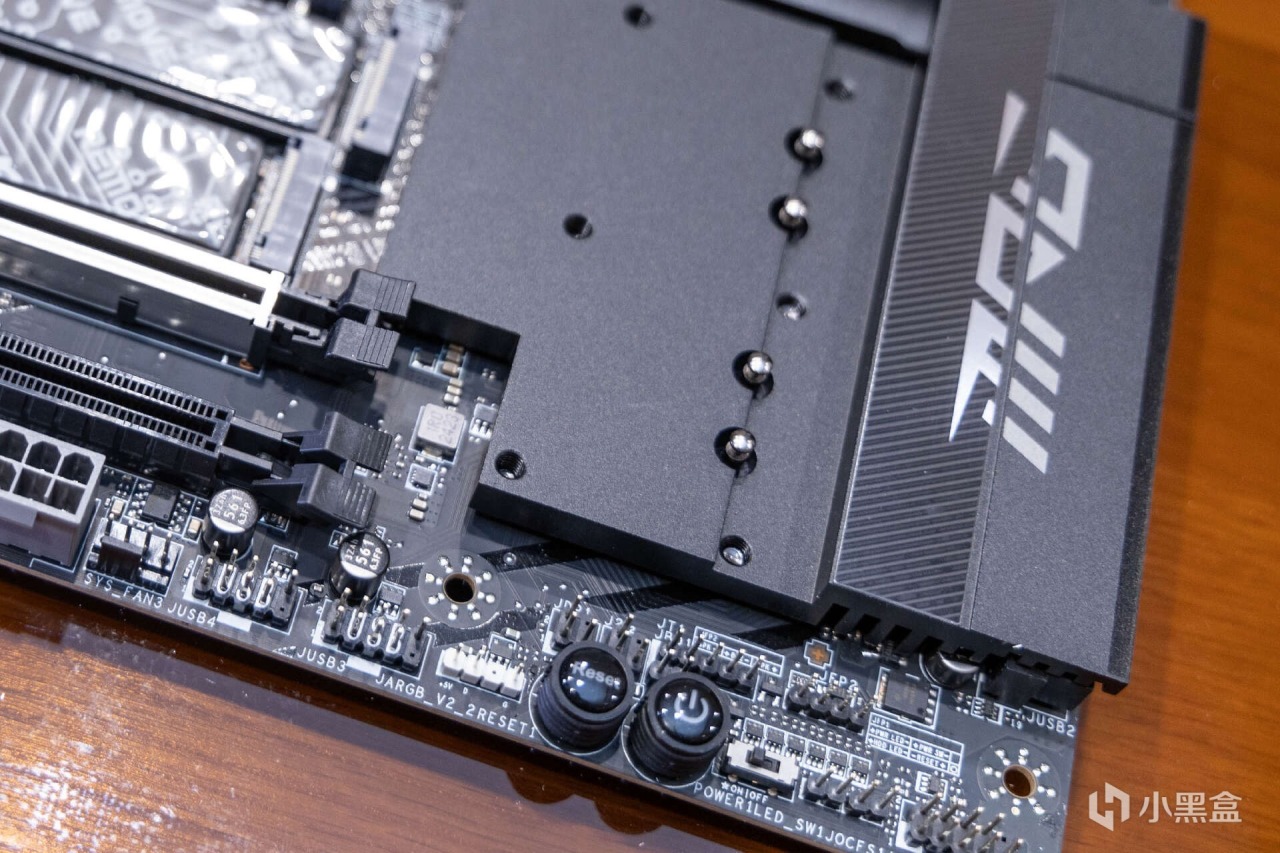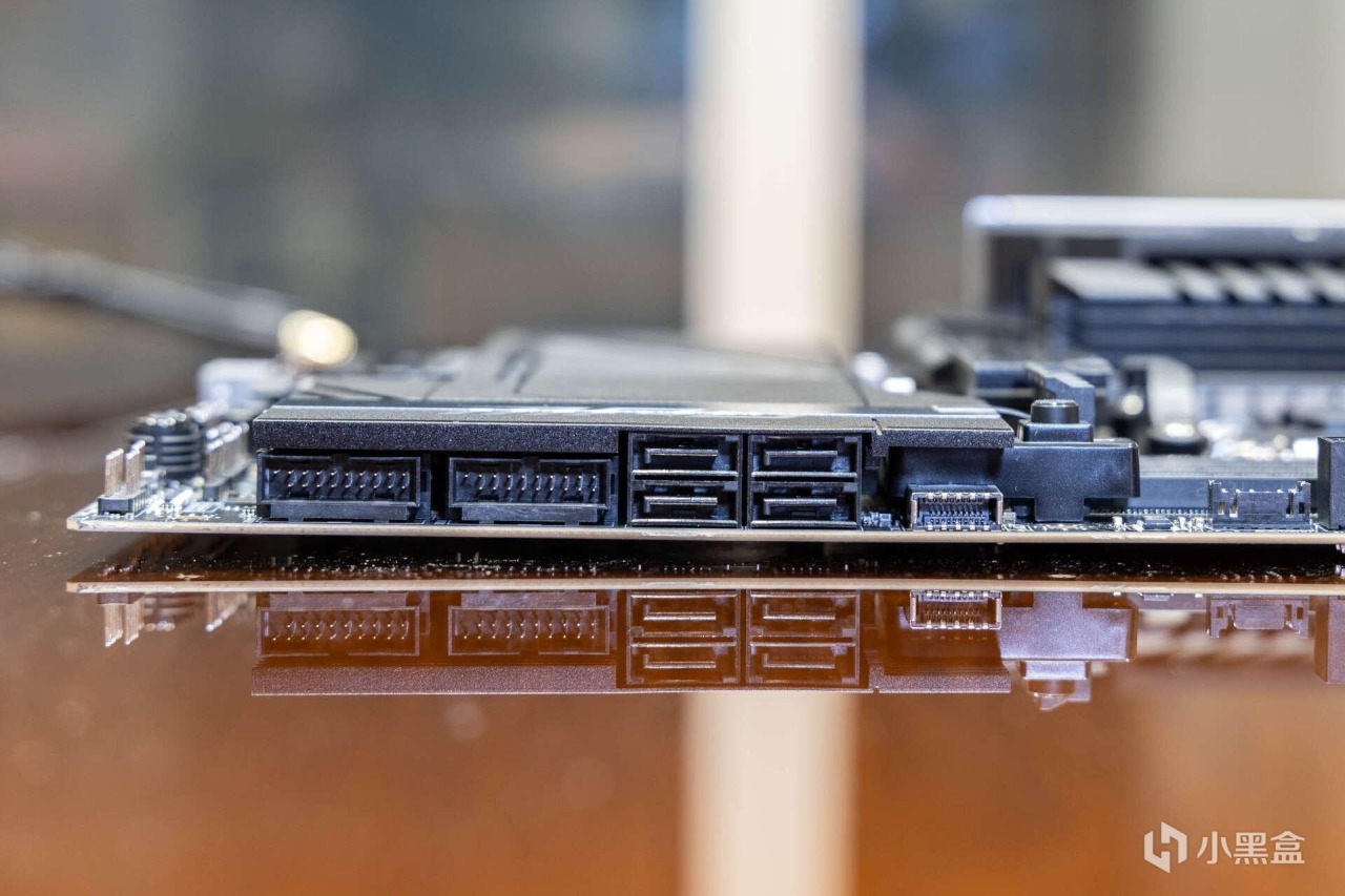主板的提供了前置USB和TYPE-C接口做了90度轉向,和4個SATA接口一起隱藏在了南橋散熱裝甲底部,讓主板整體顏值再次提升。