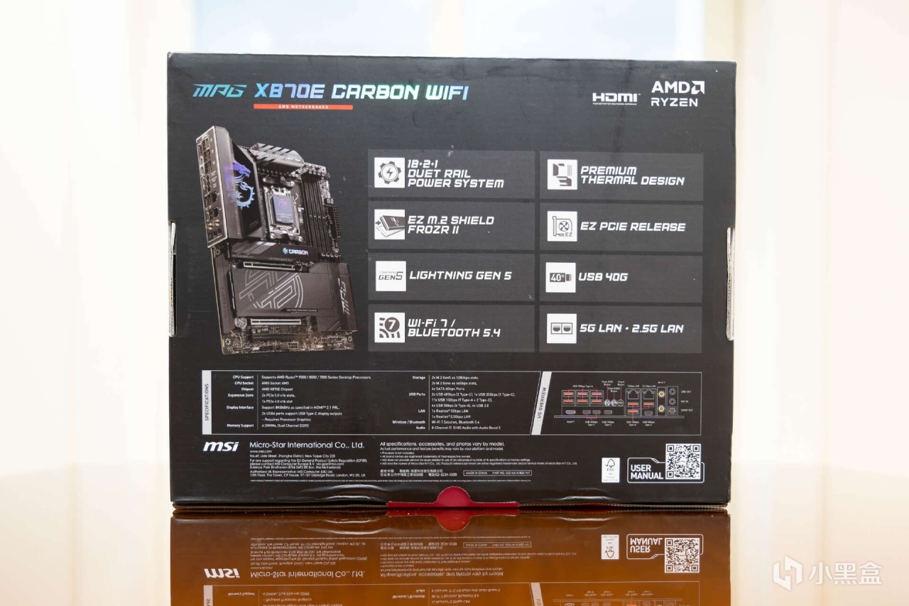 微星MPG X870E CARBON WIFI這次的包裝就設計的非常豪華,黑紅色的外殼也極具電競感。包裝正面除了可以看到主板的型號標識和實物展示外,還能看到Lightning USB 40G接口,WIFI7以及5G有線網絡等醒目標識。