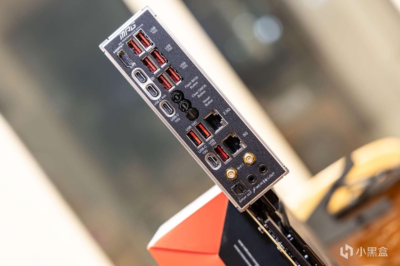 作爲一款高端定位的主板,微星MPG X870E CARBON WIFI背部I/O接口豪華到讓人驚豔。它提供了2個USB 40Gbps Type-C接口,2個USB 10Gbps Type-C接口,9個USB 10Gbps Type-A接口,1個HDMI 2.1 Port接口,2.5G+5G雙有線網絡,一組Wi-Fi/ Bluetooth Antenna接口,一組包含S/PDIF OUT光纖輸出的音頻接口和一組Clear CMos Button+Flash Bl0S Button+Smart Button的實體按鍵組合。在這樣誇張的接口數量的基礎上,你甚至都看不到藍色的USB接口,配置方面真的非常誇張。