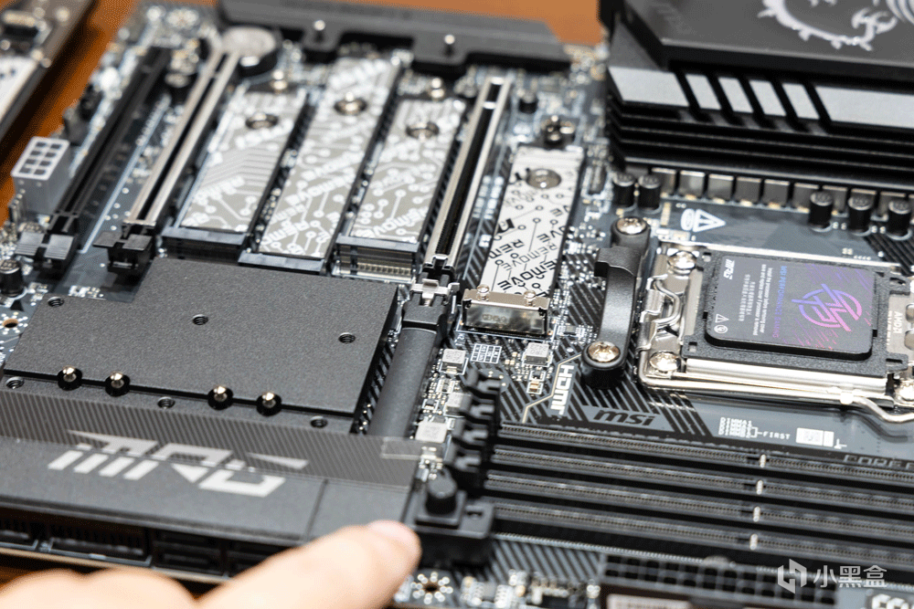微星MPG X870E CARBON WIFI配備了 4 個 M.2 固態硬盤位,其中靠近 CPU 插槽的 PCIe 5.0×4接口覆蓋在獨立散熱器下,而剩餘三個盤位則並排放置。