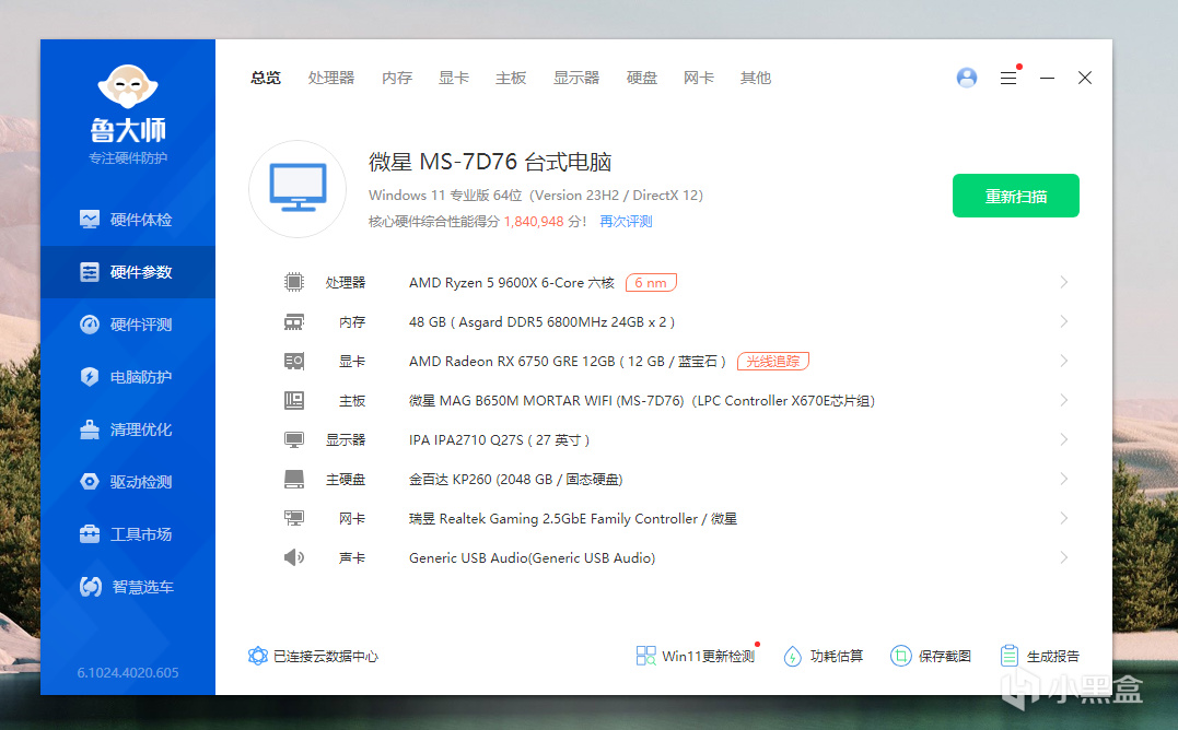 看看电脑的配置,CPU是AMD 9600X,内存是宏碁DDR5内存6800MHz 32GB (16GBx2),主板是微星的MAG B650M MORTAR WIFI。
