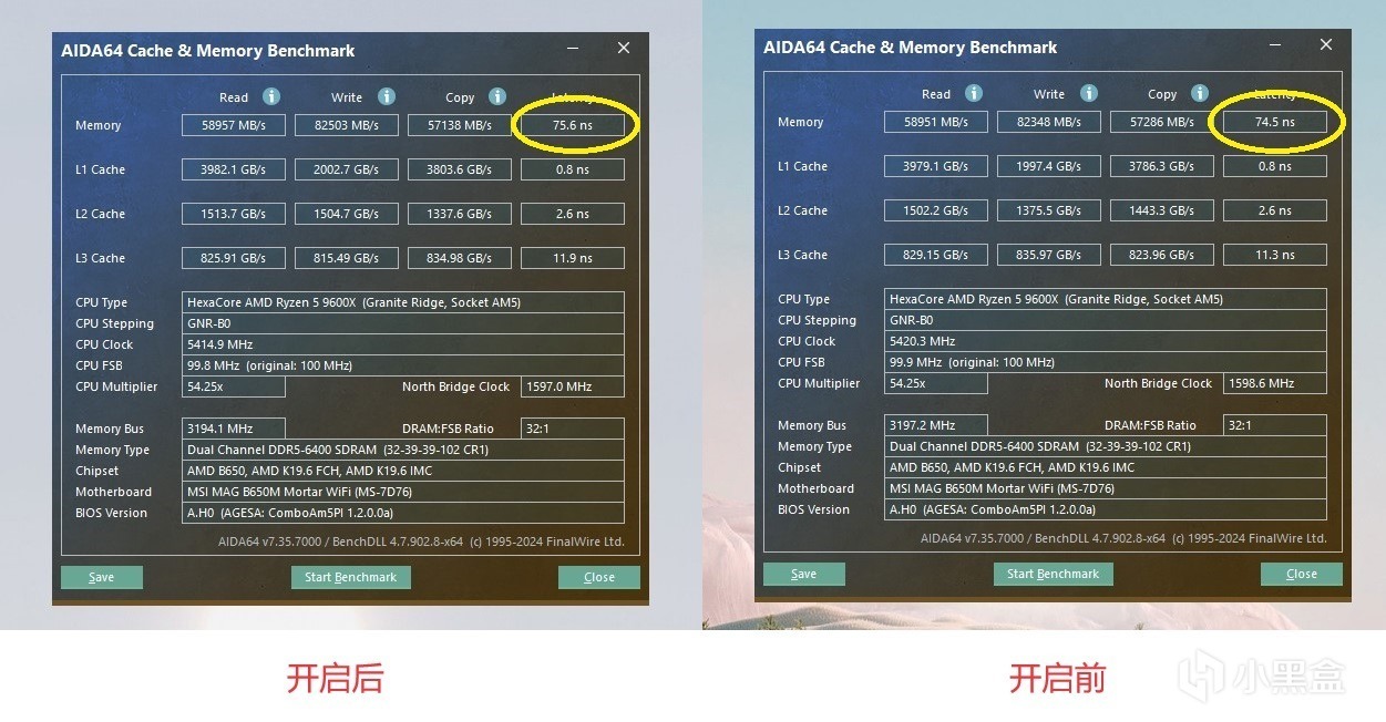那么这个对于系统使用有什么影响吗?我们用AIDA64内存测试,看到读写速度没有什么变化,而延迟,从74.5变成了75.6,略微增加,可以说是基本没有什么影响。
