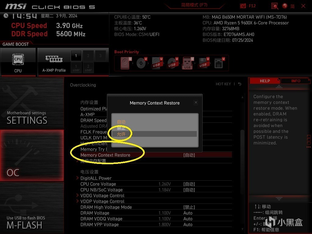 好的,我们看如何设置来减少开机时间。重新启动电脑,按Del按键进入到BIOS里面,选择高级模式,在OC页面里,找到Memory Context Restore这个选项,默认是自动,我们选择为允许。