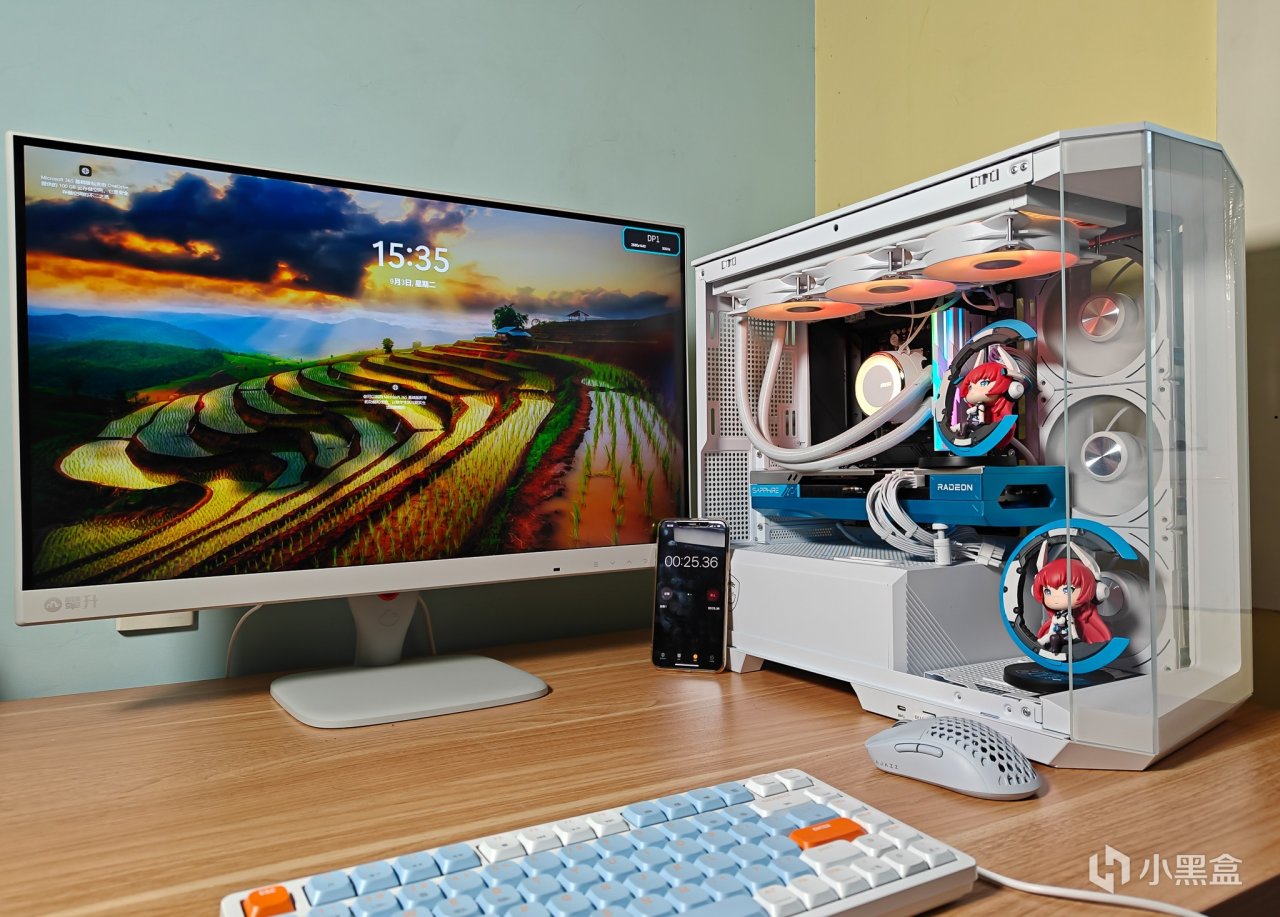 水冷散热器采用了微星的360水冷MAG CORELIQUID E360 WHITE。冷头表面是铜制底座,内置高密度水道,散热效果好。冷头是双腔体设计,支持270度旋转。冷头内置三相减震马达,可以让水泵运行更加安静,稳定。