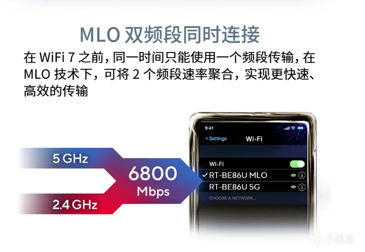 ▼對於普通用戶用戶而言,Wi-Fi 7 協議中最引人注目的特性莫過於 MLO(Multi-Link Operation)多鏈路聚合技術。相較 Wi-Fi 6 只能單獨選擇2.4GHz 頻段或者 5GHz,Wi-Fi 7能讓設備同時接入兩個不同的 Wi-Fi 頻段,例如 2.4GHz 與 5GHz,或者 5.2GHz 與 5.8GHz,網速疊加還在其次,最重要的是穿牆性能可以大幅提升。,連接也更穩定。