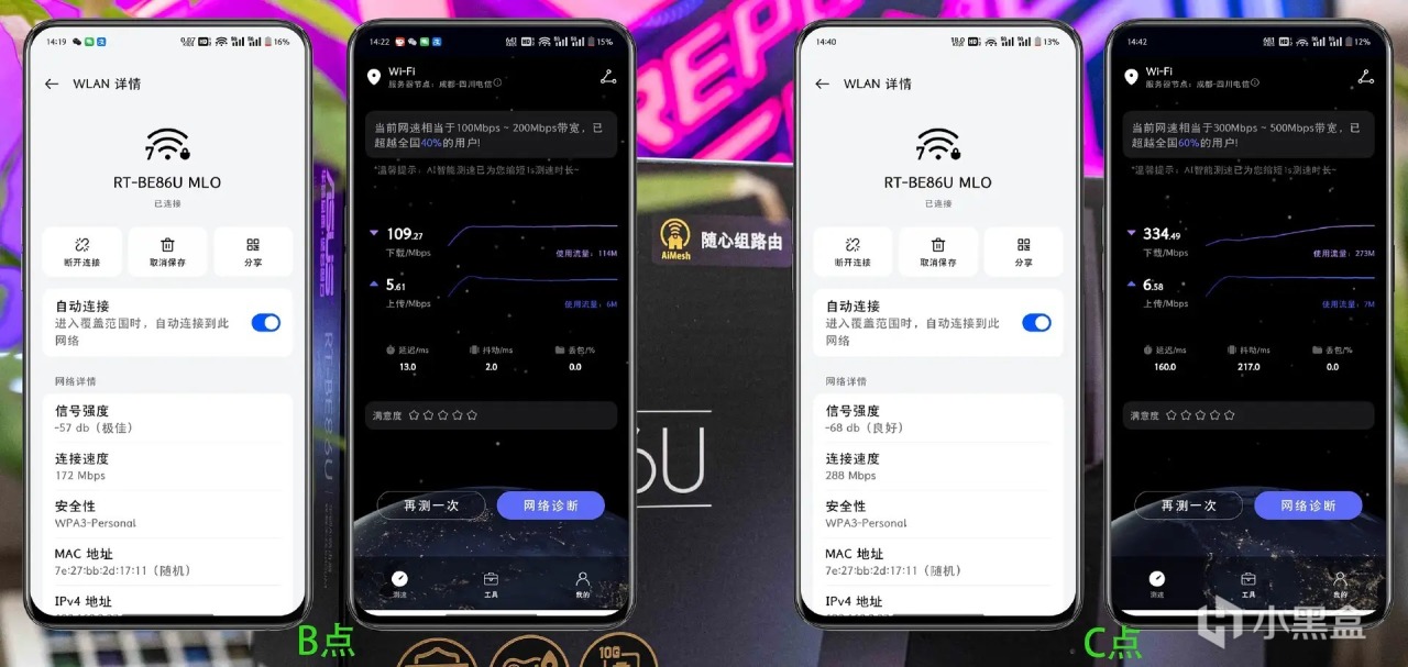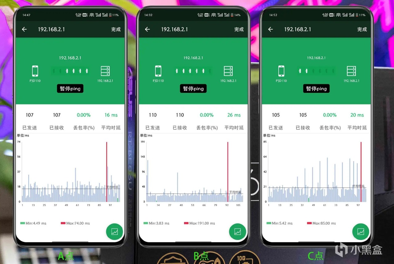 ▼啓用 MLO 功能後,不僅顯著增強了信號穿透牆壁的能力,還大幅提升了傳輸速度和連接的穩定性。通過向 ABC 三個測試點發送數據包,每個點發送超過 100 個數據包,測試結果顯示全程沒有發生任何丟包現象。講真,WiFi7 加持下的 RT-BE86U 無線穩定性的確強悍,幾乎給人一種一旦連接上信號就不會輕易斷開的穩定感。