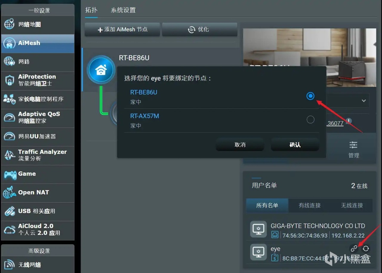 ▼不可不提的是,華碩的 AiMesh 支持指定設備與指定節點綁定,比如可以將同在臥室的電視與節點路由進行綁定,避免電視抽風去連接客廳的主路由。
