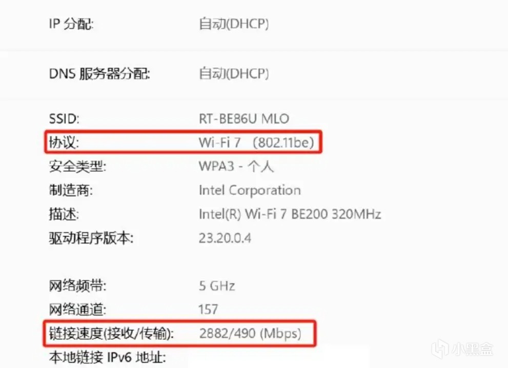 ▼電腦端這裏我用的自購的 BE200 無線網卡,網絡屬性這裏可以看到直接激活了 WiFi7 協議,當前鏈接速率達到了 2882Mbps。