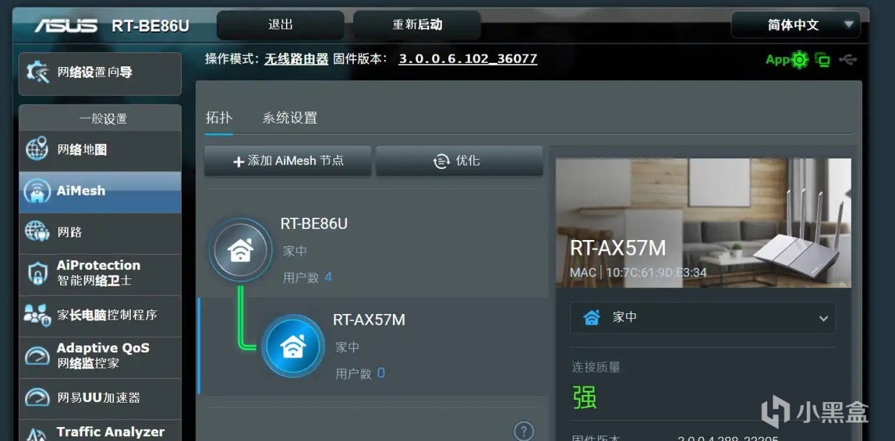 ▼華碩的 AiMesh 經過多年的發展,現在已經成爲當前第一梯隊的 Mesh 技術。配對輕鬆,管理直觀,節點切換主動高效,而且只要是華碩旗下支持 MESH 功能的路由器都能相互配對組網,不限平臺,不限型號,比如下圖的組網方式,就是博通 WiFi7 ( BE86U )與 聯發科 WiFi6 (AX57熱血版)進行的組網。