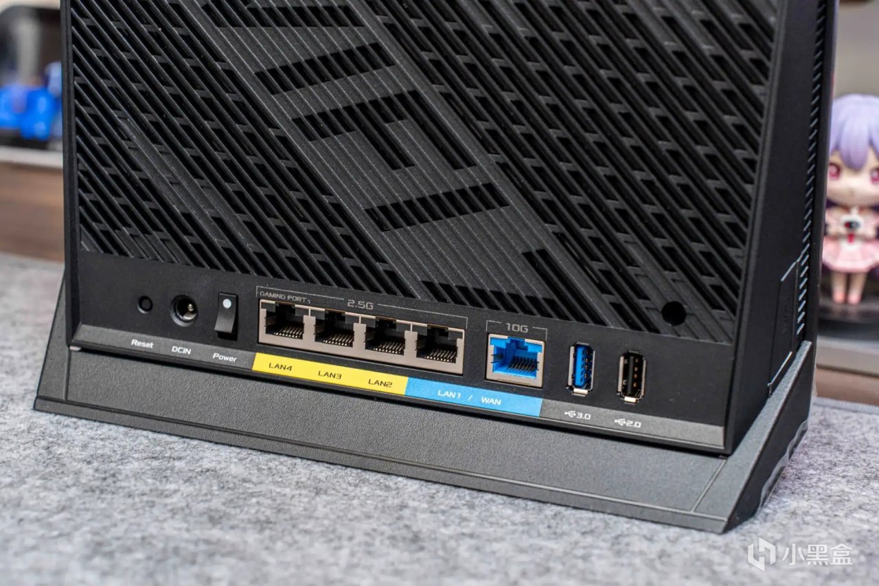 接口配置,10G 網口 * 1+ 2.5G 網口 * 4,有線傳輸高達 20G,支持 AI WAN 口自動識別和鏈路聚合,拓展端口爲 USB3.2Gen1 * 1 + USB2.0 * 1。