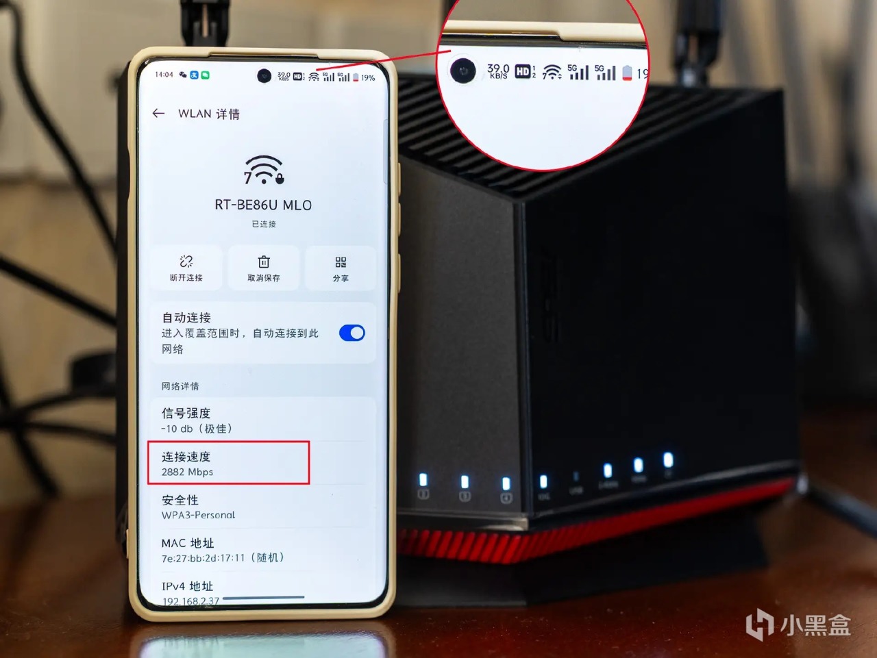 ▼我這裏使用的是手頭的一加12,儘管它算不上滿血 Wi-Fi 7 ( 2 x 2 MIMO ),然而,得益於其支持wifi7 的 4K QAM高速率,它還是達到了 2882Mbps 本機的最大速率(WiFi6 是 2401)。另外注意右上角標示說明當前已運行在 WiFi7 協議。