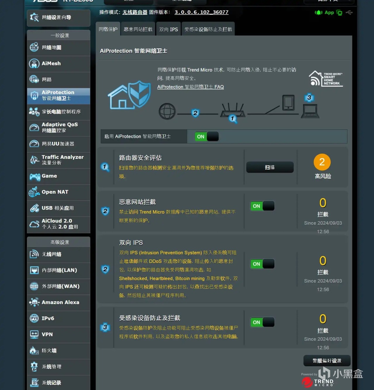 華碩路由器除了性能調教出色,固件和系統絕對是 T1 級別的存在。功能全面詳細、運行穩定性也是首屈一指,很多大神的改版固件都是基於華碩固件開發。得益於處理器的性能提升,華碩也開始將 AI 引入系統底層,而這也是 BE86U 的主打功能。