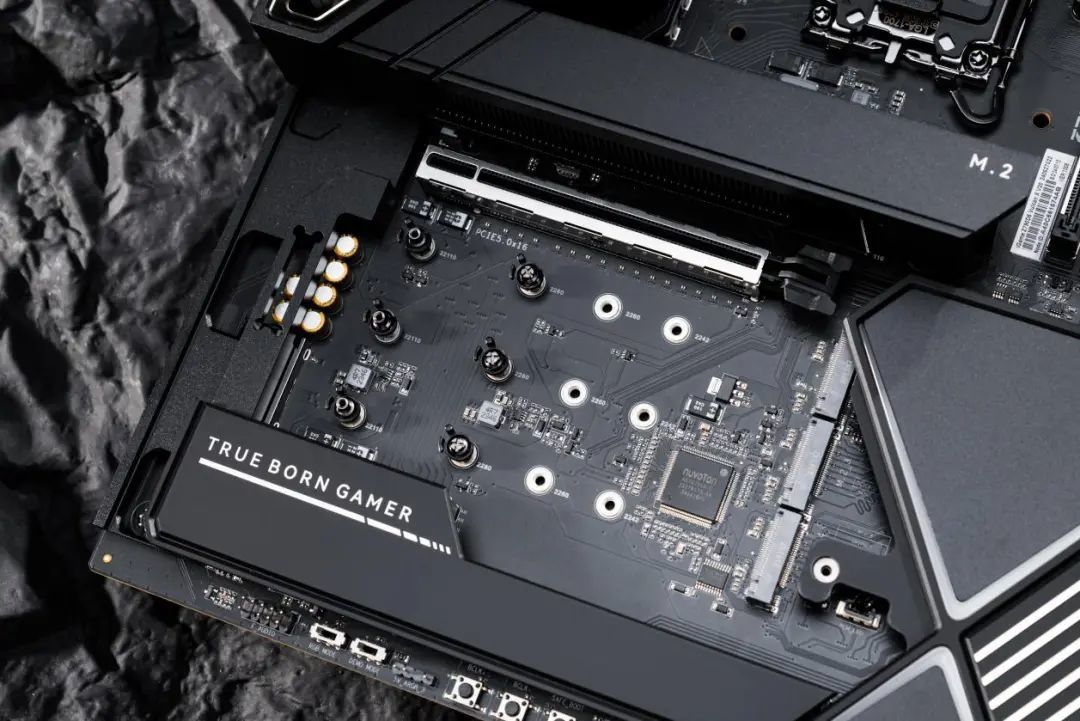 扩展插槽部分,iGame Z790火神上有1条PCIe 5.0×16插槽、1个PCIe×16插槽和1个PCIe 4.0 x4插槽。除了PCIe 5.0×16主显卡插槽之外,其余插槽都隐藏在散热片下。同时主显卡插槽的PCIe通道也进行了拆分,最靠近CPU插座的M.2_1插槽使用时,插槽就会将以×8模式运⾏,考虑到PCIe 5.0超大的带宽,依然能满足旗舰显卡的运行需求。主板还提供了多达4个M.2插槽,全部覆盖有散热装甲。特别值得一提的是,M.2_1插槽支持的是PCIe 5.0×4通过,可以搭配PCIe 5.0 M.2 SSD打造出超高性能的存储系统。只是考虑到相关SSD超高的发热量,所以此处配备的散热片也进行了强化。