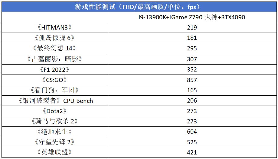 在游戏性能方面,iGame Z790火神的表现同样出色,i9-13900K处理器和RTX 4090FE显卡的性能都得到了充分地发挥,表明了主板在各种性能的呈现上没有明显的短板,搭配旗舰CPU和显卡毫无压力。