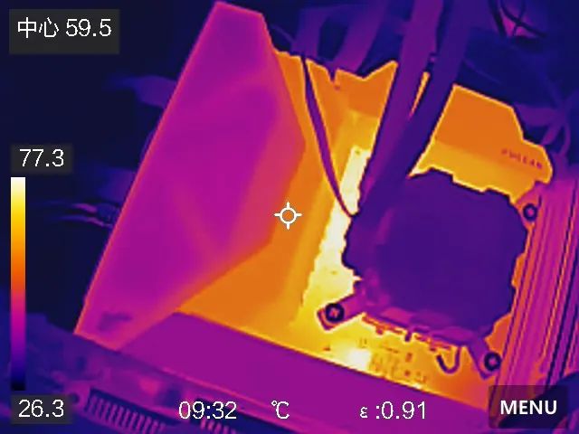 在考机测试的过程中,i9-13900K一直处于满载状态,所以我们我们使用热成像仪考查了iGame Z790火神主板供电模块的温度表现。供电部分最高温度为59.5℃,并没有受室温高的影响,发热控制得还算不错。
