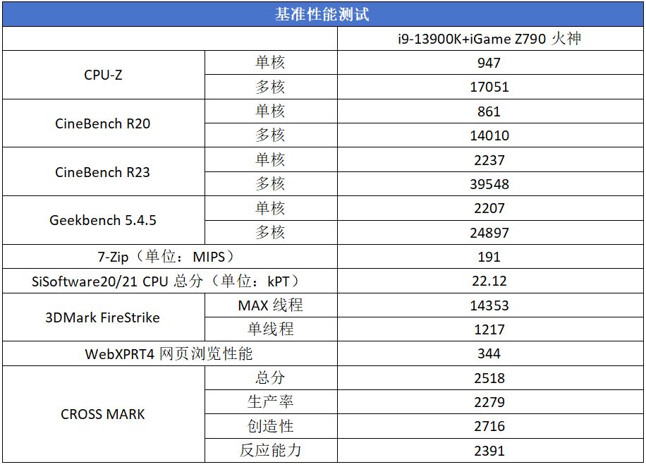 在针对CPU性能的基准测试软件的考验中,i9-13900K的成绩表现不错,在我们测试过的成绩中都属于比较靠前的,这说明iGame Z790火神主板对CPU的供电支持很到位,让i9-13900K性能得到了充分地发挥。