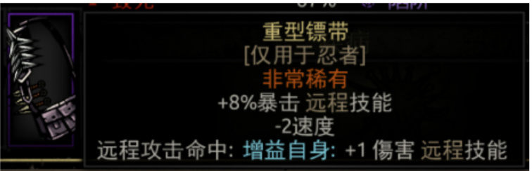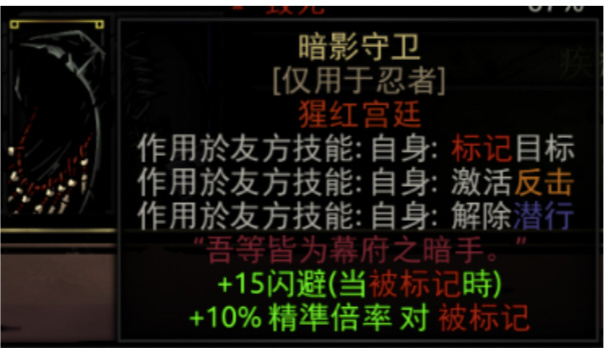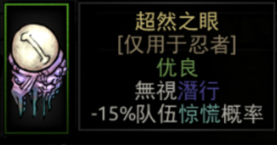 自身+30%怪物惊慌概率,队伍潜行时+20%暴击,第一回合+20%伤害(均为4场战斗)