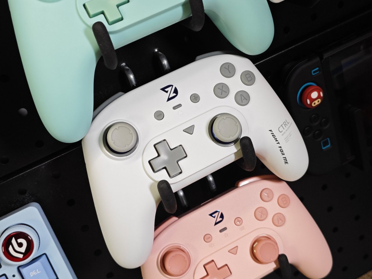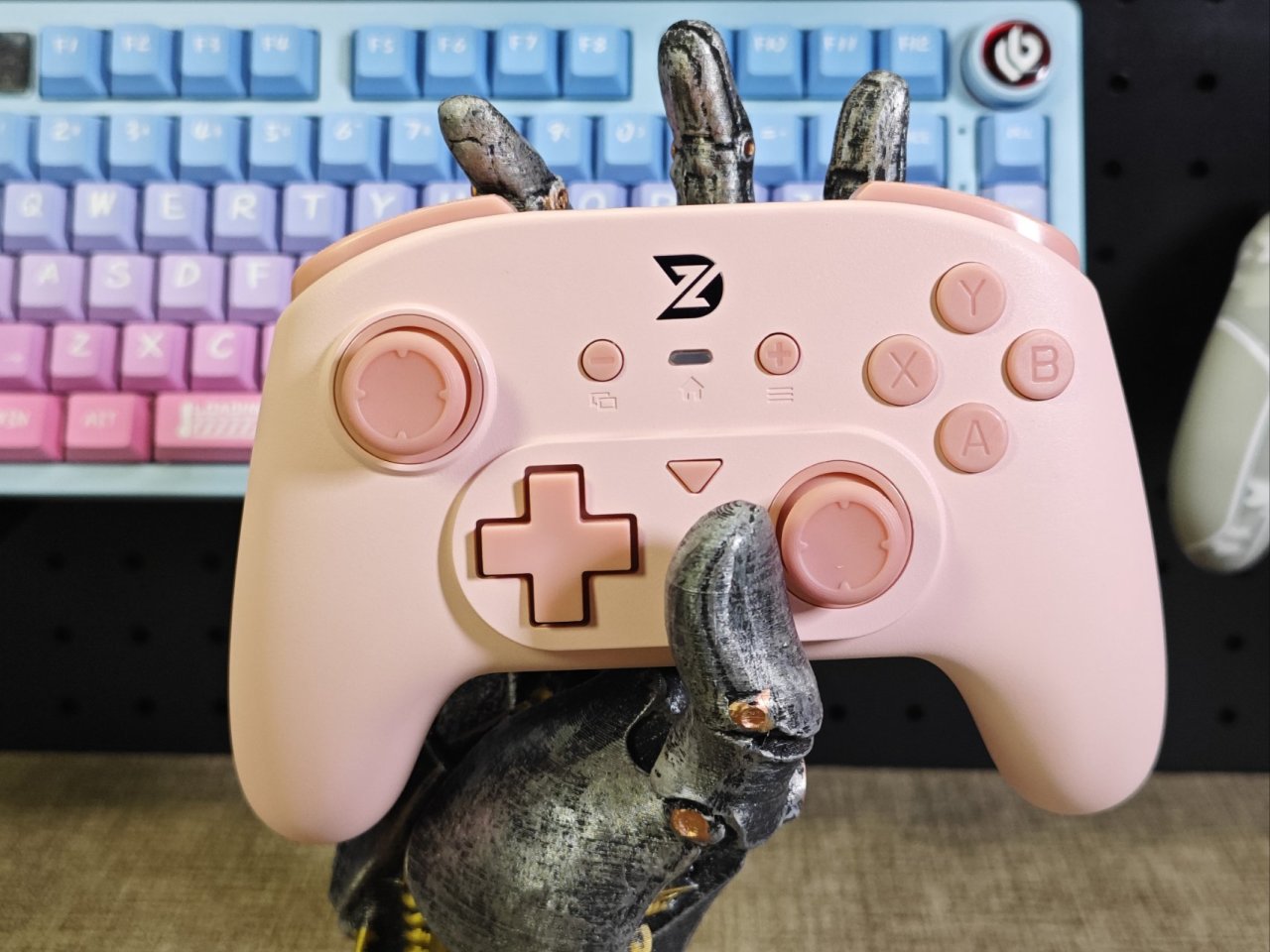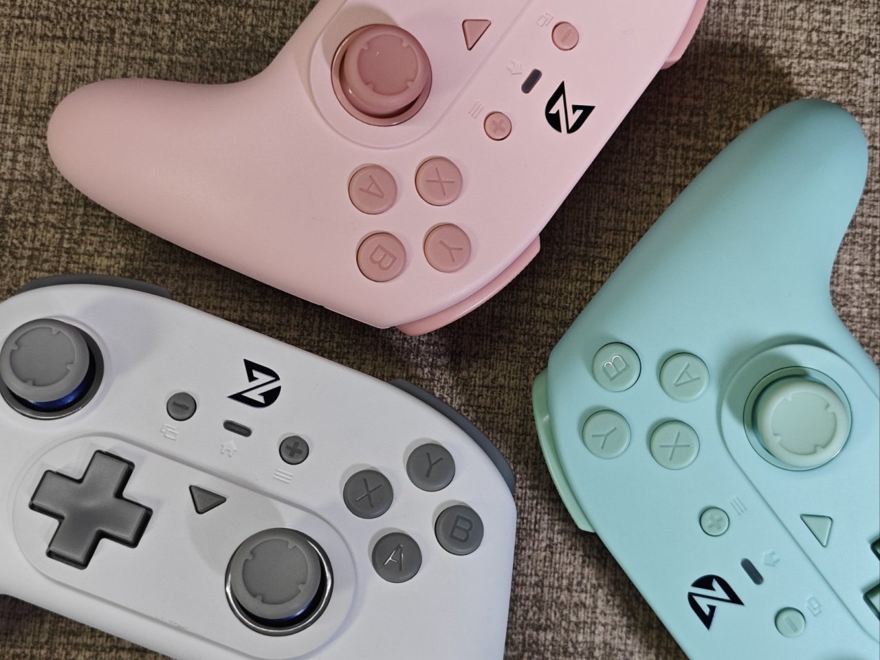 手柄的标准版与Pro版使用的模具是同一款,个人感觉这个模具有一种PS手柄的味道,他的握把位置做得较短且较细,中间面板做的比较长一点,有一种PS手柄的感觉。而标准版跟Pro版最显著的外观区别在于它的配色,标准版有粉色跟绿色配色,Pro版有白色跟黑色配色。除了配色之外,Pro版在右侧握把有特殊的印花。而且Pro版中间的logo是贴好的标准版,则需要自己动手贴一下。
