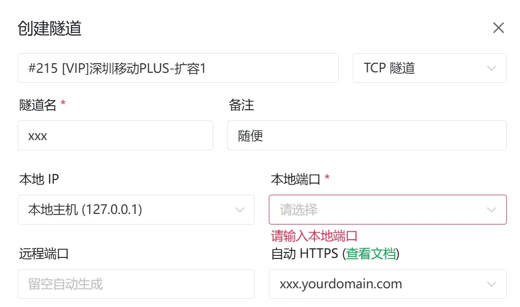 图中的本地IP,如果你在同一台机器上运行服务端和穿透客户端,则选择127.0.0.1,否则填写服务端所在设备的内网IP(例如你决定在路由器或另一台内网设备上跑穿透)。本地端口为你的服务端所使用的端口。
