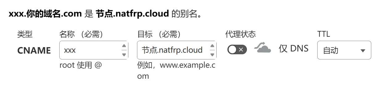 将网页提供的Name去掉主域名和顶级域名(即yourdomain.com这部分),保留子域名填入Cloudflare的名称一栏