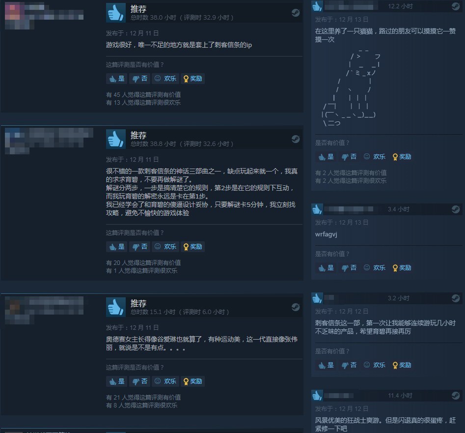 給予好評的玩家表示不要臉的阿育終於回Steam了,《刺客信條:英靈殿》是一款很不錯的刺客信條遊戲,能讓人連續遊玩幾小時不乏味,風景也很優美。遊戲戰鬥系統進化,兜帽和潛入系統更加合理。