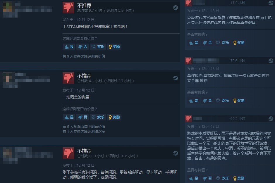 給予差評的玩家認爲《刺客信條:英靈殿》有很多重複枯燥的內容,是一個龐大、空洞、美麗的罐頭。遊戲操作手感差,部分機制不合理,還有閃退黑屏現象發生。最可氣的是,育碧把遊戲拿到Steam賺錢也不把成就拿上來,真是懶惰的混蛋。