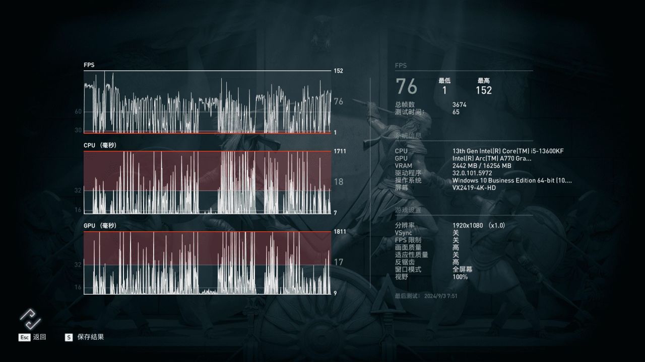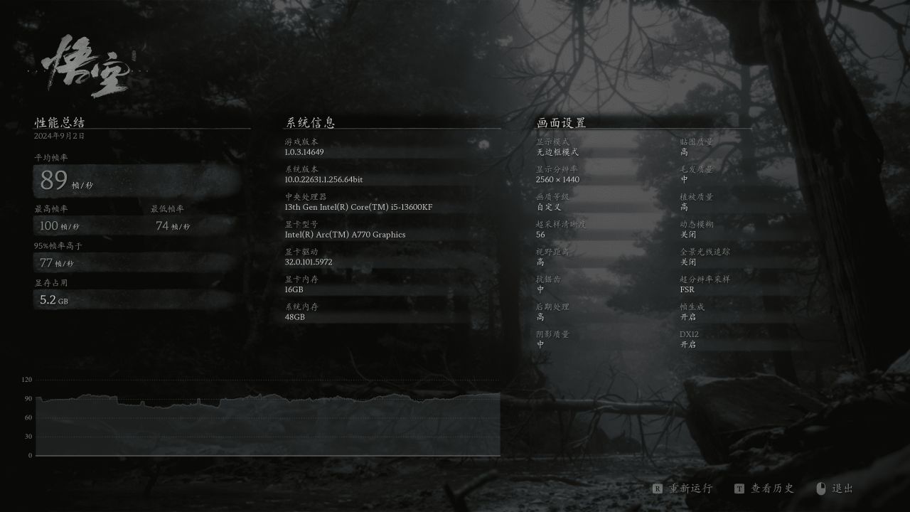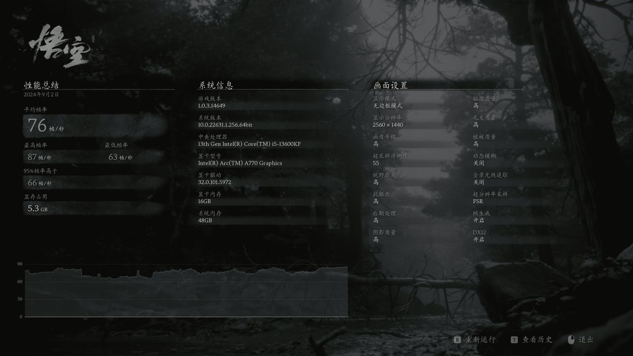 黑神话悟空,选择2K(2560×1440)分辨率下,游戏画质预设高,平均帧:76 帧/秒。可以看到在1080P分辨率下仅有52帧,反而在2K分辨率下帧数提高到了76帧,说明Intel显卡还是很有潜力的。